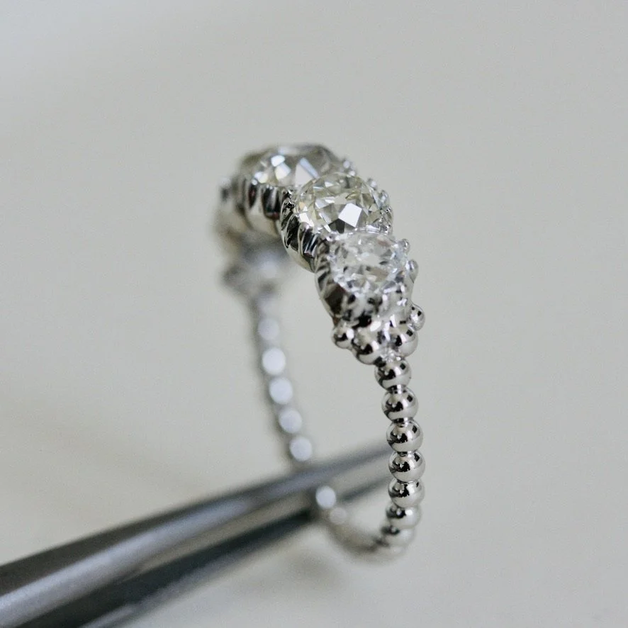 Close-up of a silver ring with large diamonds and smaller beads, held by tweezers.