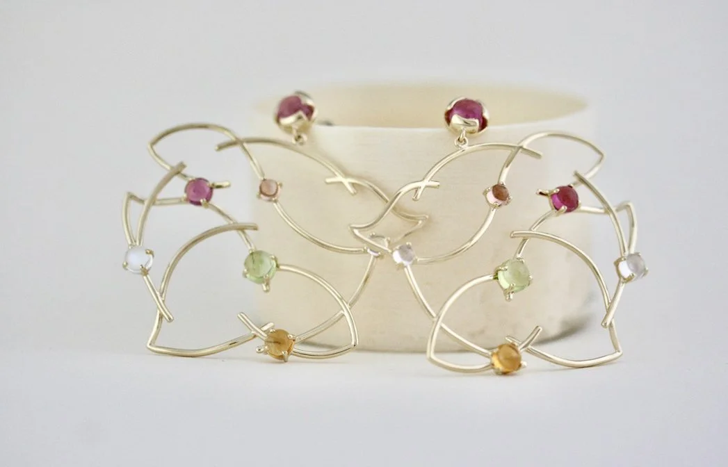 Jewelry set including earrings and bracelet with leaf motifs and colorful gemstones.