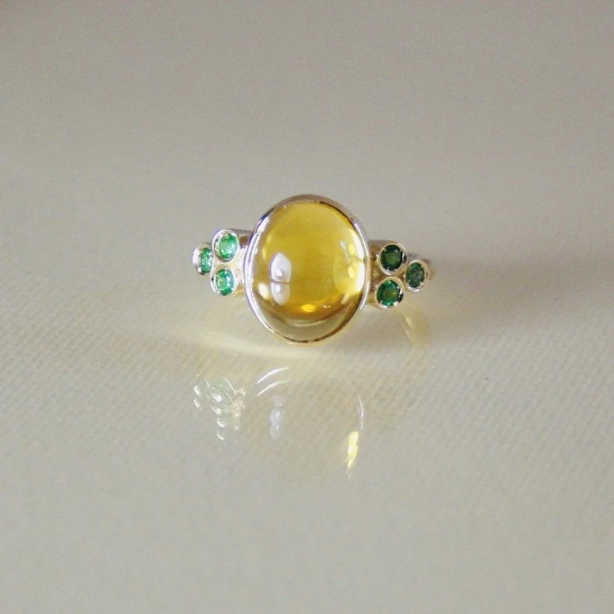 Silver ring with a large yellow oval gemstone and six small green gemstones on each side