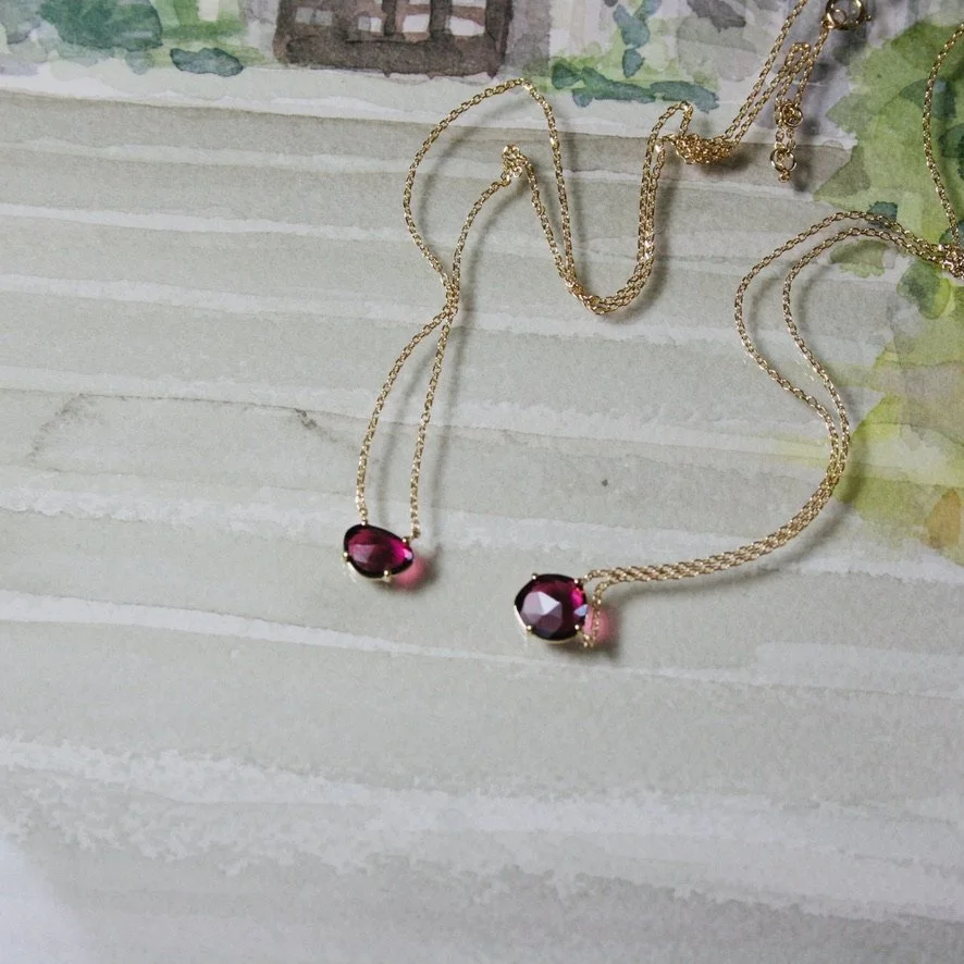 Gold chain necklace with two dark pink gemstones, resting on a light-colored surface with a subtle striped pattern.