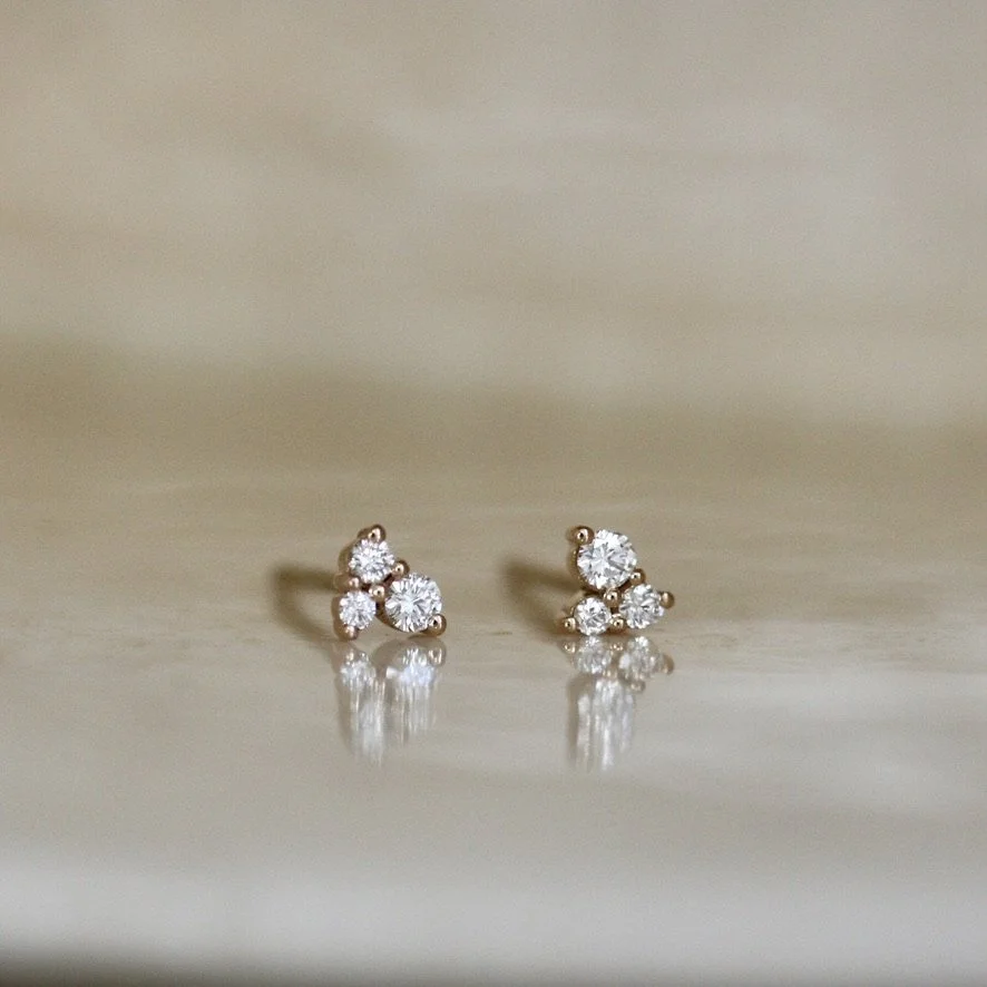 Pair of gold earrings with three diamonds each, placed on a reflective surface.