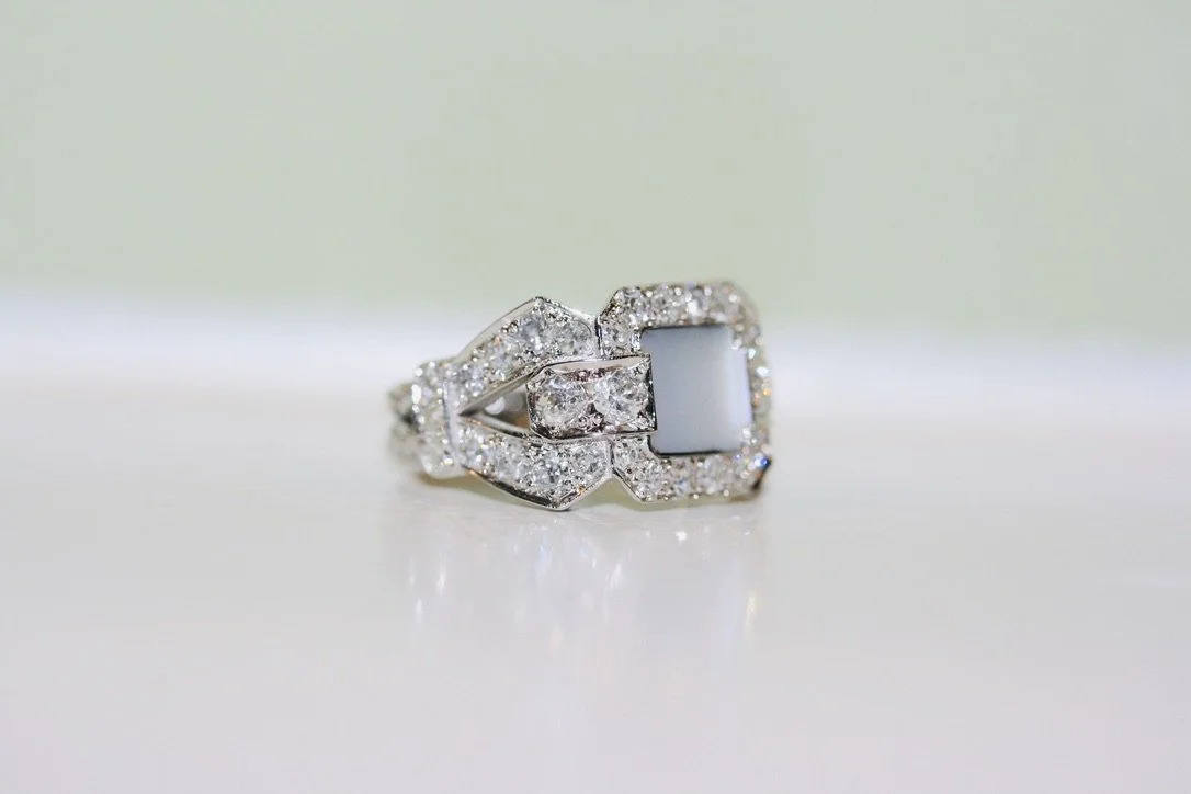 A silver ring with a large rectangular white gemstone surrounded by small diamonds, displayed on a reflective surface.